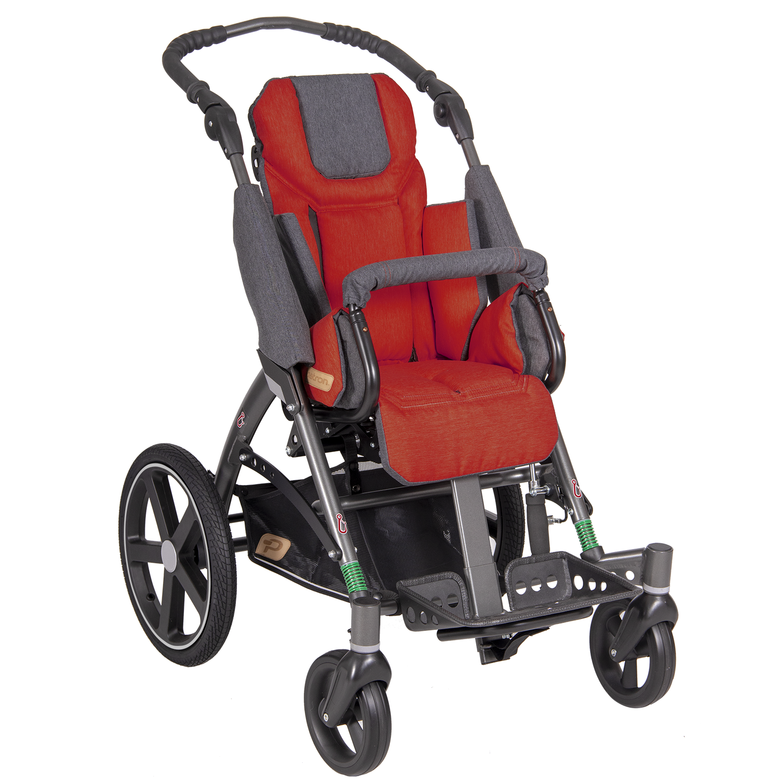 Speciálně vyvinutá sedačka se zvětšenou velikostí. Jedinečný produkt optimalizovaný pro velmi vysoké a štíhlé děti. Kočárek s většími zadními koly o průměru 400 mm.
